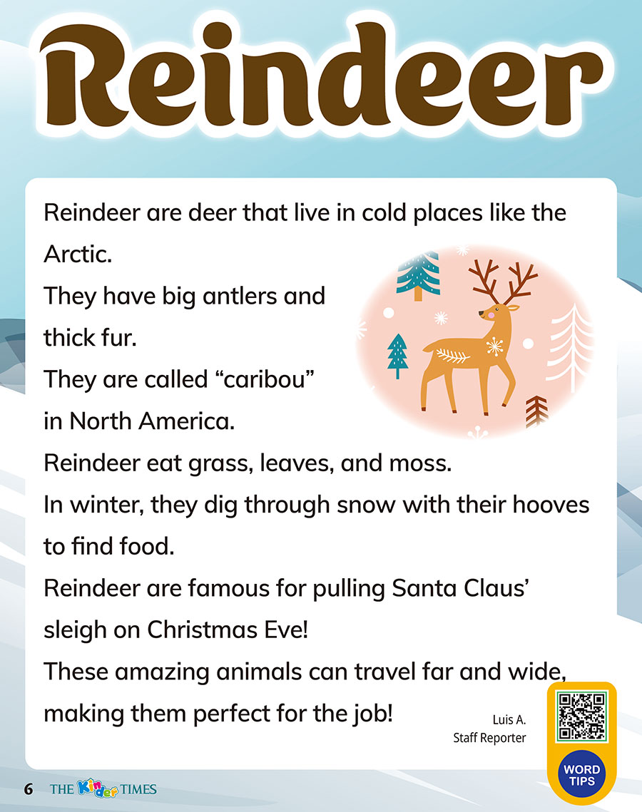 "wordtip" => "reindeer 순록 / Arctic 북극 / antler 뿔 / thick 두꺼운 / fur 털 / leaves 나뭇잎 (leave의 복수) / dig through ~을 파다 / hooves 발굽들 (hoof의 복수) / famous 유명한 / pull 끌다 / amazing 놀라운 / far 멀리 / perfect 완벽한",