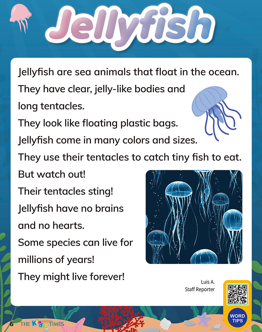 "wordtip" => "float 떠다니다 / clear 투명한 / tentacle 촉수 / catch 잡다 / tiny 매우 작은 / watch out 조심하다 / sting 쏘다 / brain 뇌 / heart 심장 / species 종 (생물 분류의 기초 단위) / millions of 수백만의 / forever 영원히",