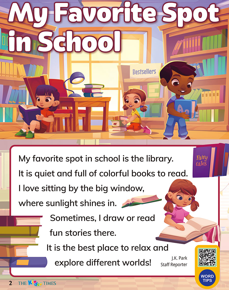 "wordtip" => "favorite 가장 좋아하는 / library 도서관 / quiet 조용한 / colorful 다채로운 / sometimes 때때로, 가끔 / best 가장 좋은, 최고의 (good의 최상급) / relax 쉬다 / explore 탐험하다",