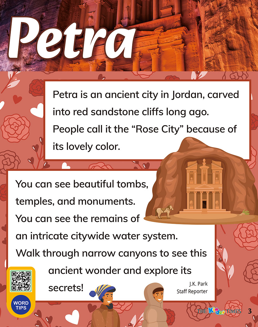 "content_kor" => "페트라는 요르단에 있는 고대 도시로, 오래전에 붉은 사암 절벽을 깎아 만들어졌어요.