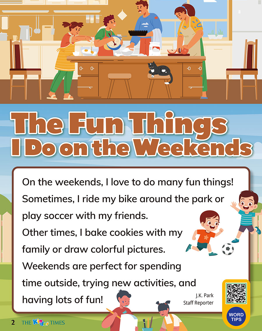 "wordtip" => "weekend 주말 / fun 재미있는 / sometimes 때때로 / ride 타다 / bike 자전거 / park 공원 / soccer 축구 / bake 굽다 / cookie 쿠키 / draw 그리다 / colorful 알록달록한 / pictures 그림 / perfect 완벽한 / outside 밖에서 / activities 활동 (activity의 복수) ",