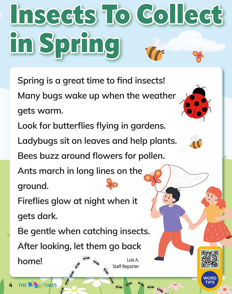 "wordtip" => "spring 봄 / insect 곤충 / bug 벌레 / weather 날씨 / warm 따뜻한 / butterfly 나비 / garden 정원 / ladybug 무당벌레 / leaves 나뭇잎 (leaf의 복수) / buzz 윙윙거리다 / pollen 꽃가루 / march 행진하다 / fireflies 반딧불이 (firefly의 복수) / catch 잡다