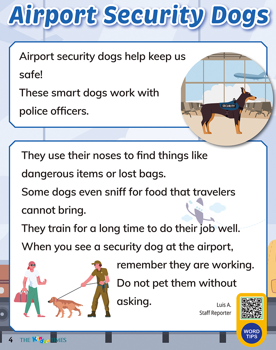 "wordtip" => "security dog 탐지견 / safe 안전한 / smart 똑똑한 / police officer 경찰관 / dangerous 위험한 / lost 잃어버린 / sniff (코를) 킁킁거리다 / traveler 여행자 / train 훈련하다 / job 일 / remember 기억하다 / pet 어루만지다, 쓰다듬다",