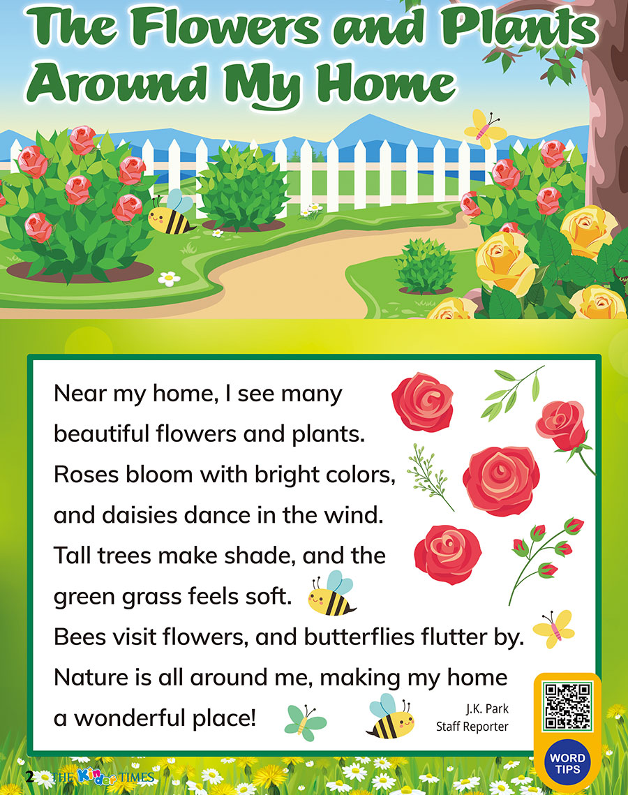 "content_kor" => "우리 집 근처에서, 나는 많은 아름다운 꽃과 식물들을 봐요.