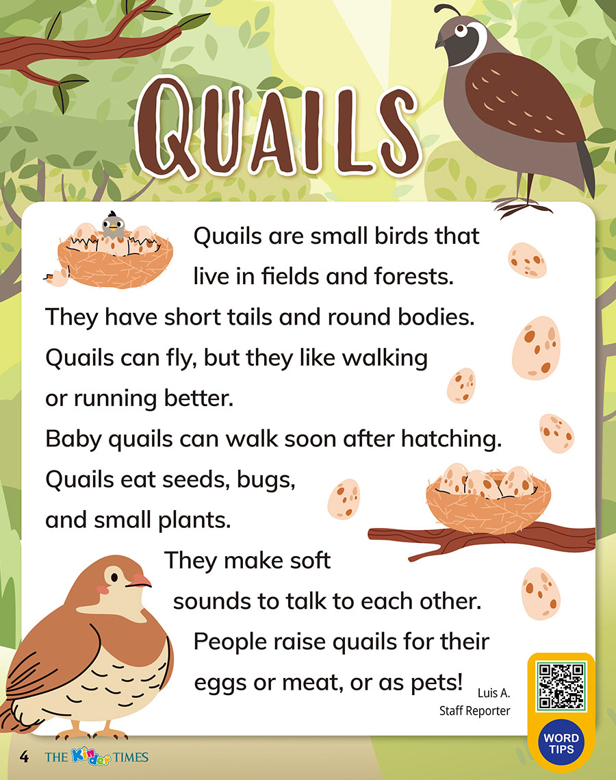 "wordtip" => "quail 메추라기 / field 들판 / forest 숲 / tail 꼬리 / round 둥근 / hatch 부화하다 / seed 씨앗 / bug 벌레 / plant 식물 / sound 소리 / each other 서로 / raise 기르다, 키우다 / meat 고기 / pet 반려동물",