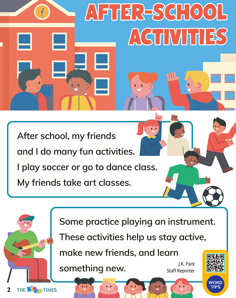 "content_kor" => "학교가 끝난 뒤, 친구들과 나는 재미있는 활동을 많이 해요.