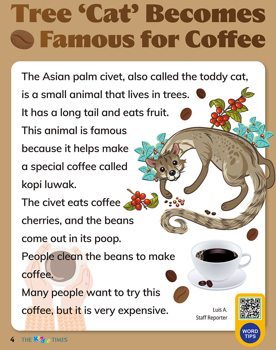 "wordtip" => "palm civet 사향고양이 / also called ~라고도 불리는 / live 살다 / tail 꼬리 / fruit 과일 / bean 원두, 콩 / poop 배설물 / clean 깨끗이 하다 / try 시도하다, 먹어보다 / expensive 비싼",