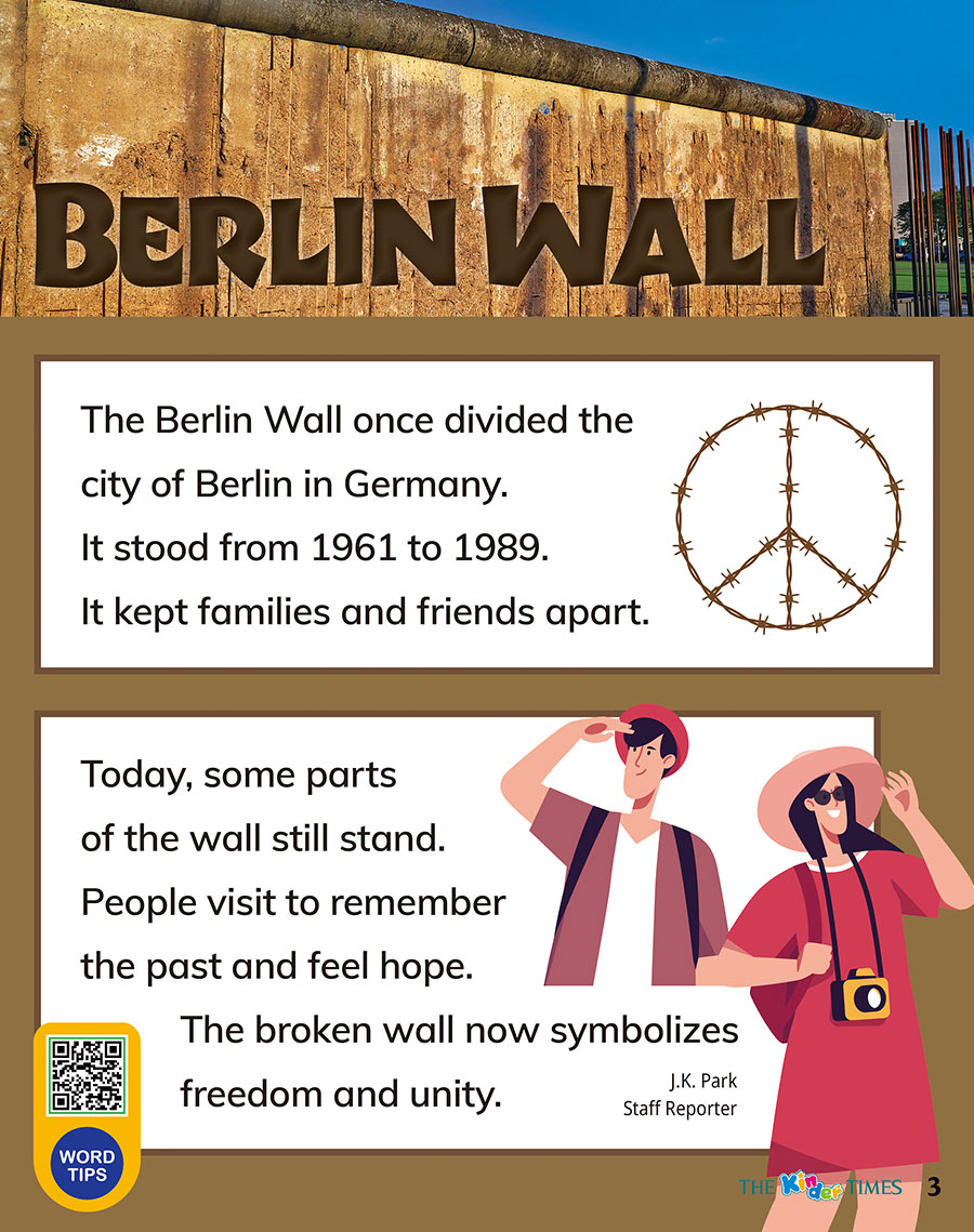 "wordtip" => "once 한때 / divide 갈라놓다 / stood 서 있었다 (stand의 과거형) / kept ~ apart ~를 멀어지게 하다 (keep apart의 과거형) / part 일부 / visit 방문하다 / remember 기억하다 / hope 희망 / broken 부서진 / symbolize 상징하다 / freedom 자유 / unity 통일