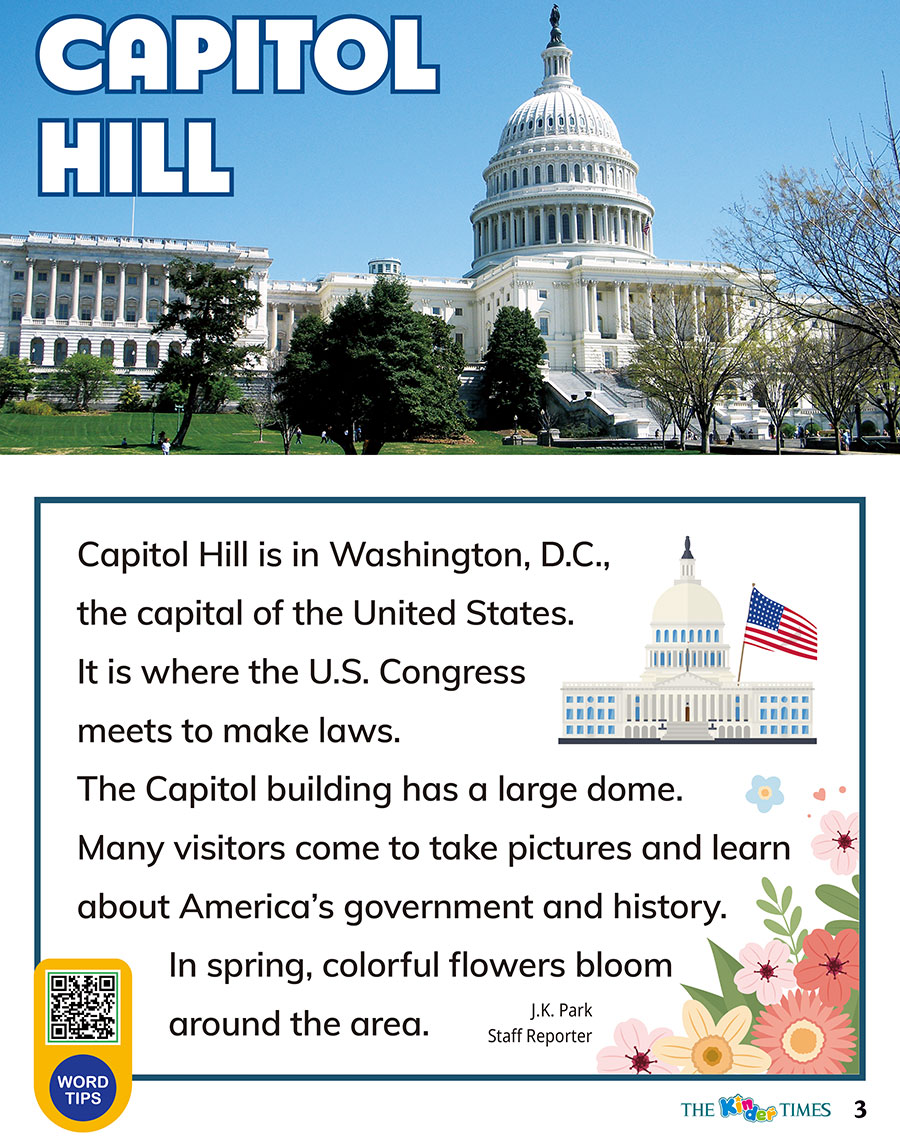 "wordtip" => "Capitol Hill 국회의사당 언덕 / capital 수도 / Congress 의회 / law 법 / visitor 방문객 / take pictures 사진을 찍다 / government 정부 / bloom 꽃이 피다 / area 지역 / colorful 알록달록한